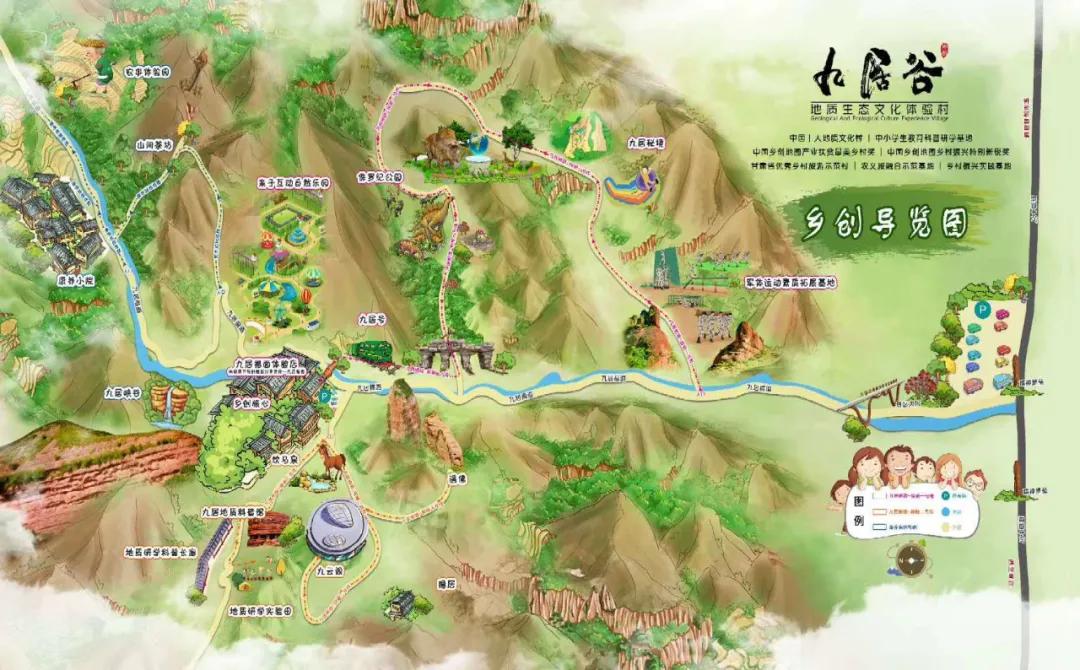依托獨特的丹霞地質、地貌優勢和淳樸的鄉土風情,以“地質觀園、康養福地”為總體定位。堅持“地質為基、文化為魂、融合為要、惠民為本”的基本原則,將九居谷地質文化村內部地質資源、景觀、產業、村莊等元素統一整合,綜合集成旅游觀光、生態涵養、歷史文化、文化創意、科普教育等內容,建成形式多樣、產業融合、特色鮮明的谷域產業經濟帶,從而達到促進經濟、社會、環境等綜合效應的一種發展形態。以“地質+旅游”“地質+教育”“地質+康養”“地質+生態”等綜合服務的文化模式建設發展。