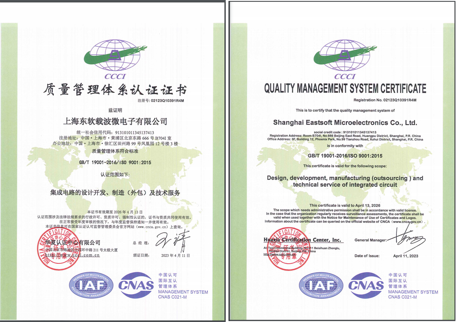 上海東軟載波微電子有限公司依照ISO9001建立管理體系,形成文件,確定質(zhì)量管理體系的過程, 制定相關(guān)準則和方法,保有效運作和監(jiān)控,并持續(xù)改進其有效性。