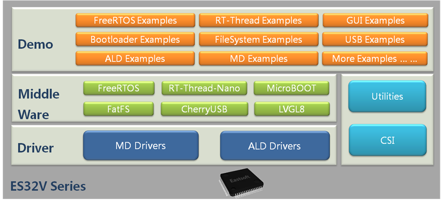 ES32V SDK是東軟載波微電子開發(fā)的、面向ES32V系列微控制器內(nèi)核以及外設(shè)的一套高集成、易使用、面向過程與對(duì)象相結(jié)合的驅(qū)動(dòng)庫(kù),包括MD、ALD、中間層驅(qū)動(dòng)。SDK兼容CSI標(biāo)準(zhǔn),可高效移植不同的操作系統(tǒng)、文件系統(tǒng)等第三方軟件。SDK集成了多方中間層軟件,中間層軟件對(duì)整個(gè)ES32V系列微控制器保持兼容,能夠做到不同平臺(tái)之間的簡(jiǎn)單移植。MD驅(qū)動(dòng)面向過程開發(fā),接近微控制器底層操作,提供用戶微控制器寄存器操作簡(jiǎn)單接口,操作方便,同時(shí)MD驅(qū)動(dòng)提供內(nèi)聯(lián)以及非內(nèi)聯(lián)調(diào)用函數(shù)的方式,最大化用戶代碼執(zhí)行效率。ALD驅(qū)動(dòng)對(duì)微控制器外設(shè)做抽象化操作,是一套抽象化的面向?qū)ο蟮尿?qū)動(dòng),用戶無(wú)需更多關(guān)注底層設(shè)備的原理,只需要調(diào)用相關(guān)外設(shè)的接口函數(shù)即可對(duì)外設(shè)進(jìn)行操作,ALD驅(qū)動(dòng)同時(shí)能夠?yàn)樯蠈討?yīng)用以及操作系統(tǒng)、文件系統(tǒng)等應(yīng)用和系統(tǒng)層軟件提供接口,提高移植的兼容性。此外為了更加方便用戶使用SDK開發(fā)項(xiàng)目,ESLinkIIPro/ESLinkIIOB、USB-Lab、ES-Bridge、SCONS自動(dòng)構(gòu)建工具、ES-PDS等軟件、硬件工具都已經(jīng)推出。使用ES32V SDK開發(fā)應(yīng)用程序可以大大縮減開發(fā)時(shí)間,降低開發(fā)難度,降低項(xiàng)目開發(fā)的開銷。